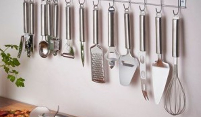 A pegboard is a cheap and brilliant way to store odd shaped items, tools or cutlery.