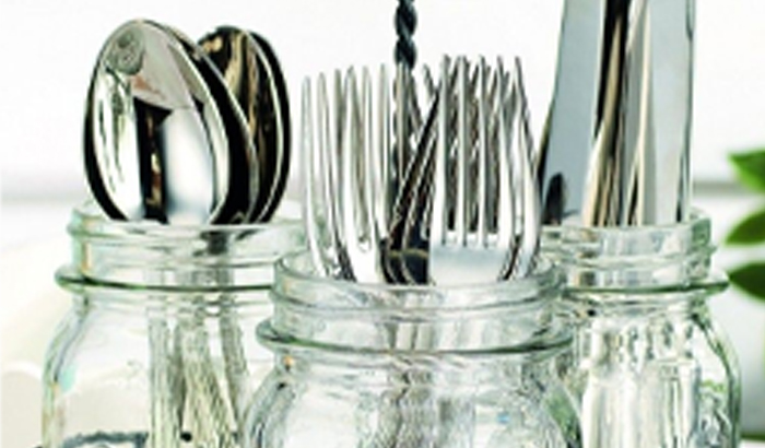 Use recycled jam and honey jars to store cutlery, stationery and other small items.Using jars not only saves you money (and earns you ‘green’ points), but they’re also great for organising as you can see what’s inside without having to open them